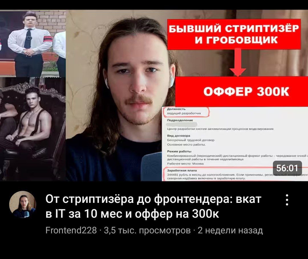 Мем представляет собой скриншот видео на YouTube, где мужчина с длинными волосами и усами смотрит в камеру. Слева от него коллаж из двух фотографий: на верхней он изображен в классическом костюме и повязке на руке, на нижней — в расстегнутой рубашке и подтяжках, сидящим на роскошном кресле. Вверху экрана красная плашка с надписью: "Бывший стриптизёр и гробовщик". Ниже, также на красной плашке, указано: "Оффер 300К", со стрелкой, указывающей на скриншот документа, где видна должность "Ведущий разработчик" и "Заработная плата 344481 рубль в месяц до налогообложения". Под видео заголовок: "От стриптизёра до фронтендера: вкат в IT за 10 мес и оффер на 300к". Этот мем демонстрирует необычный карьерный путь человека, который смог перейти из профессий стриптизёра и гробовщика в IT, получив высокооплачиваемую работу ведущего разработчика с окладом 300 тысяч рублей.