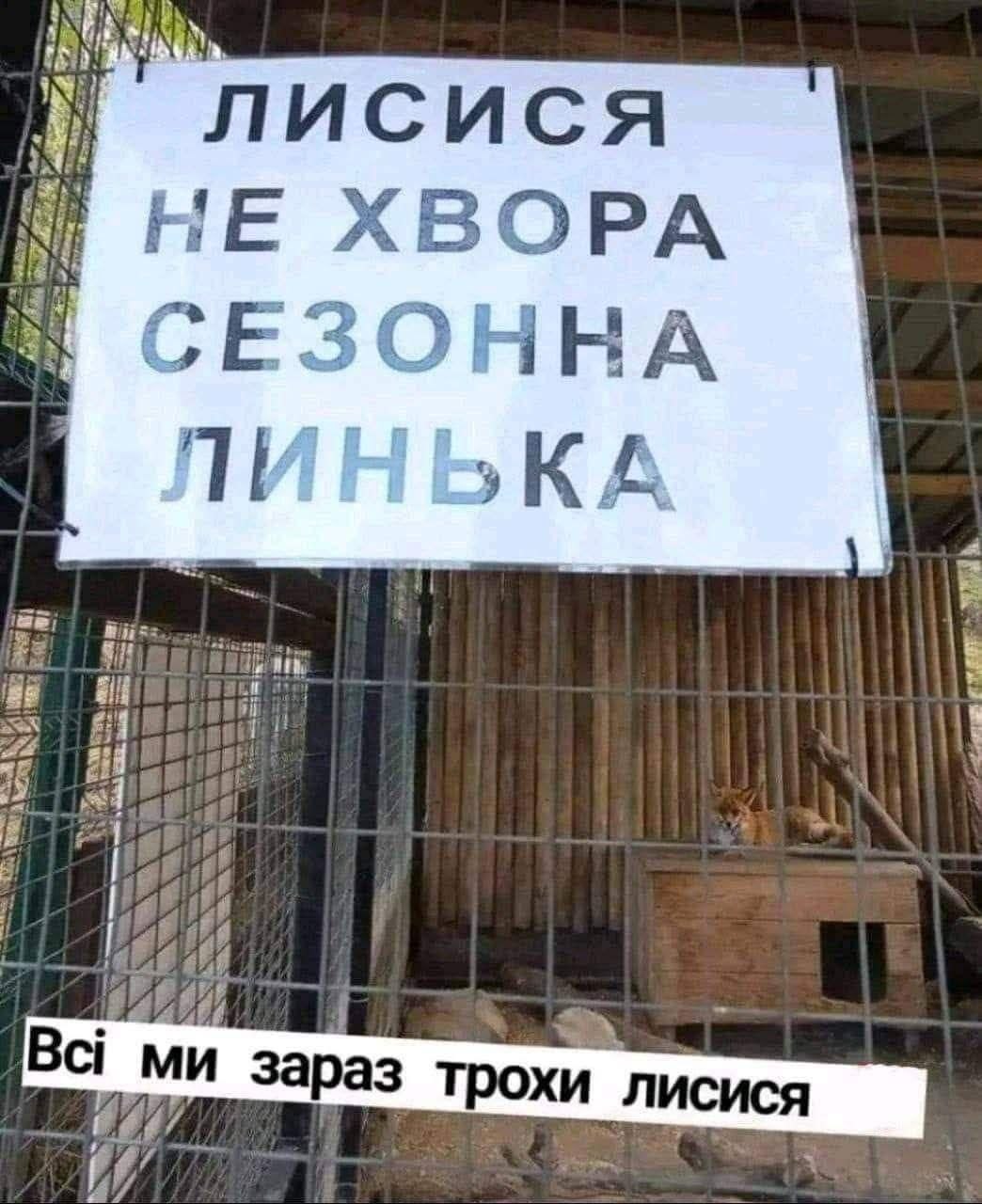 На изображении показана лиса в вольере, которая находится в процессе сезонной линьки. Рядом с вольером висит табличка с надписью «Лисиця не хвора, сезонна линька», что означает «Лиса не больна, это сезонная линька». Под вольером добавлена подпись, которая гласит: «Всі ми зараз трохи лисиця», что переводится как «Мы все сейчас немного лисица». Это подчеркивает общую усталость или "облезлость", которую многие люди могут чувствовать.