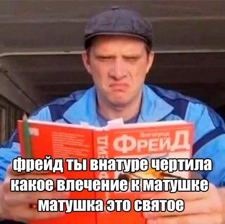 На изображении представлен мужчина средних лет в синей рубашке и кепке, который с выражением явного недовольства или возмущения читает красную книгу. На обложке книги крупными буквами написано «ФРЕЙД». Под изображением мужчины расположен текст, который передает его мысленную реакцию на прочитанное. Мужчина, по всей видимости, крайне не согласен с идеями Зигмунда Фрейда о влечении к матери (Эдипов комплекс), о чем свидетельствуют слова «Фрейд ты внатуре чертила какое влечение к матушке матушка это святое». Это выражает негодование по поводу того, что кто-то может предполагать подобные влечения к матери, подчеркивая святость образа матери.