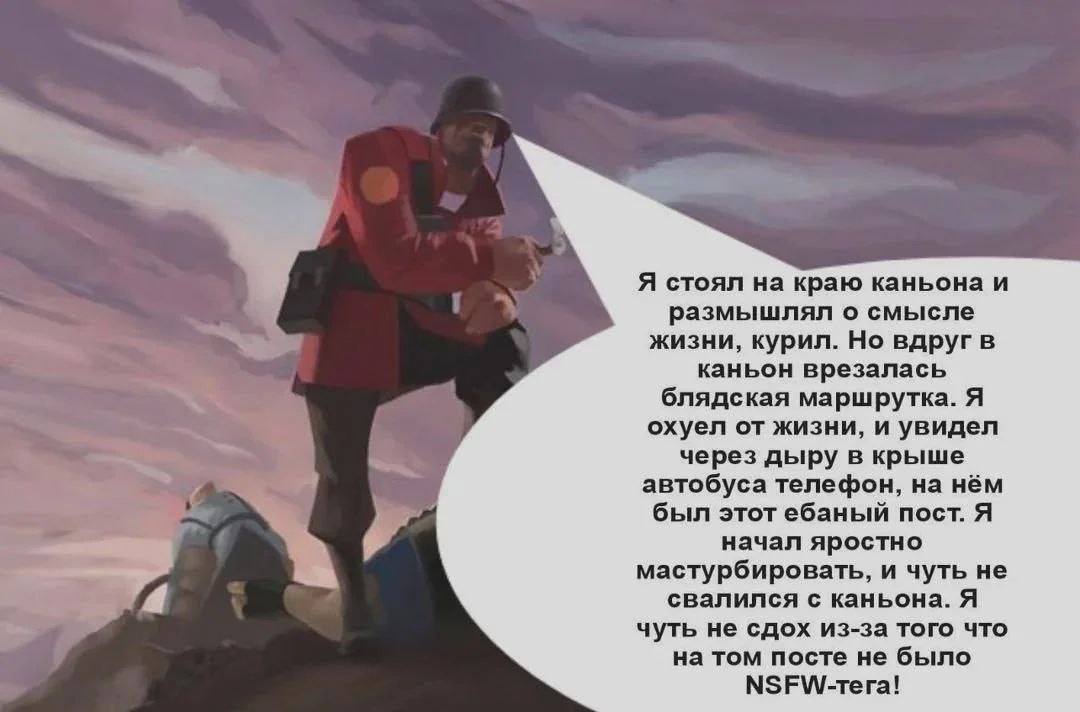 На картинке изображен Солдат из игры Team Fortress 2. Он стоит на краю каньона на закате, а рядом с ним лежит другой персонаж, также из игры. Солдат о чем-то задумался, а затем видит в разбитой маршрутке пост без NSFW-тега, что его очень злит. Солдат начинает яростно мастурбировать, и чуть не падает с каньона. Судя по всему, смысл поста в том, что Солдат был зол, что на посте не было NSFW-тега. От этого он начал яростно мастурбировать.