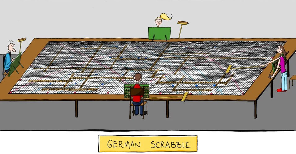 На изображении показан огромный стол, на котором разложена гигантская доска для "Скрэббла" (Scrabble). За столом сидят четыре человека: двое мужчин и две женщины. Они выглядят сосредоточенными на игре. Из-за невероятных размеров доски, чтобы дотянуться до нужных клеток, игроки используют специальные палки с приспособлениями на конце, похожими на щетки или грабли, чтобы передвигать фишки. Надпись под картинкой гласит: "Немецкий Скрэббл". Этот мем юмористически обыгрывает стереотип о длинных и сложных словах в немецком языке, предполагая, что для игры в "Скрэббл" на немецком языке требуется огромное поле из-за большой длины слов.