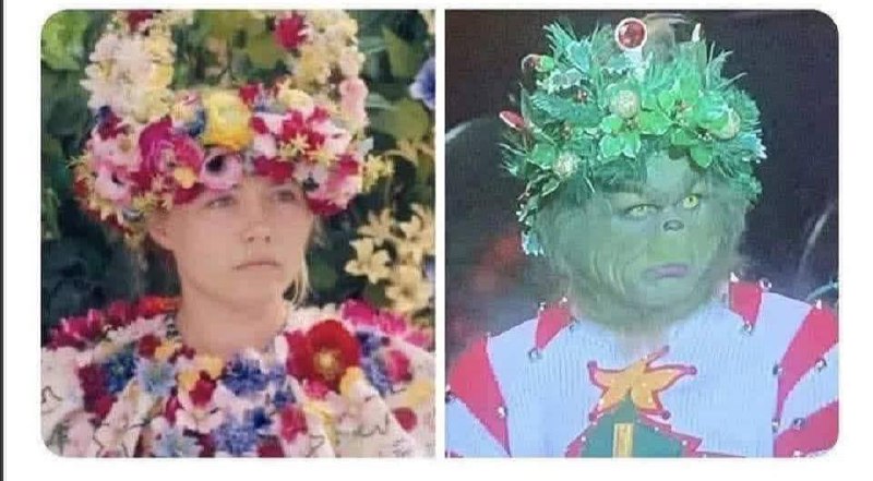 Мем состоит из двух изображений, расположенных рядом. На левом изображении представлена девушка, одетая в костюм, полностью покрытый цветами. На ее голове венок из цветов, а одежда украшена различными яркими цветами, что создает впечатление цветочного поля. Она смотрит прямо перед собой с нейтральным выражением лица. Справа изображен Гринч в новогоднем костюме, который также украшен еловыми ветками, шишками и красными ягодами, напоминающими рождественский венок. Выражение его лица выглядит недовольным или раздраженным, с прищуренными глазами и слегка нахмуренным ртом. Контраст между весенне-летним цветочным образом девушки и зимним, елочным нарядом Гринча, а также их разные выражения лиц, создают комический эффект. Многие пользователи сети сравнивают эти два образа, находя в них забавное сходство и различия.