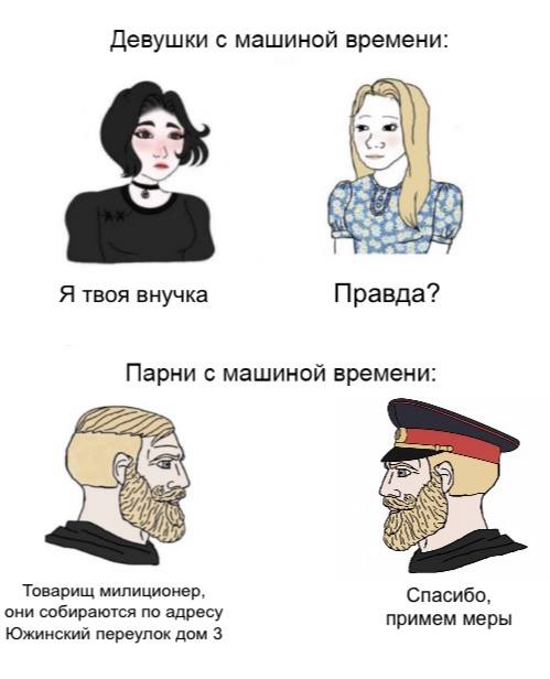 Мем разделён на две части. Верхняя часть демонстрирует двух девушек и подпись "Девушки с машиной времени". Слева изображена девушка с тёмными волосами и в чёрной одежде, заявляющая: "Я твоя внучка". Справа — светловолосая девушка в ситцевом платье, которая с удивлением спрашивает: "Правда?". Нижняя часть мема называется "Парни с машиной времени". Слева находится бородатый мужчина в профиль, который сообщает: "Товарищ милиционер, они собираются по адресу Южинский переулок дом 3". Справа изображён другой бородатый мужчина в милицейской фуражке, который отвечает: "Спасибо, примем меры". Мем обыгрывает стереотипы о том, как мужчины и женщины могли бы использовать машину времени.