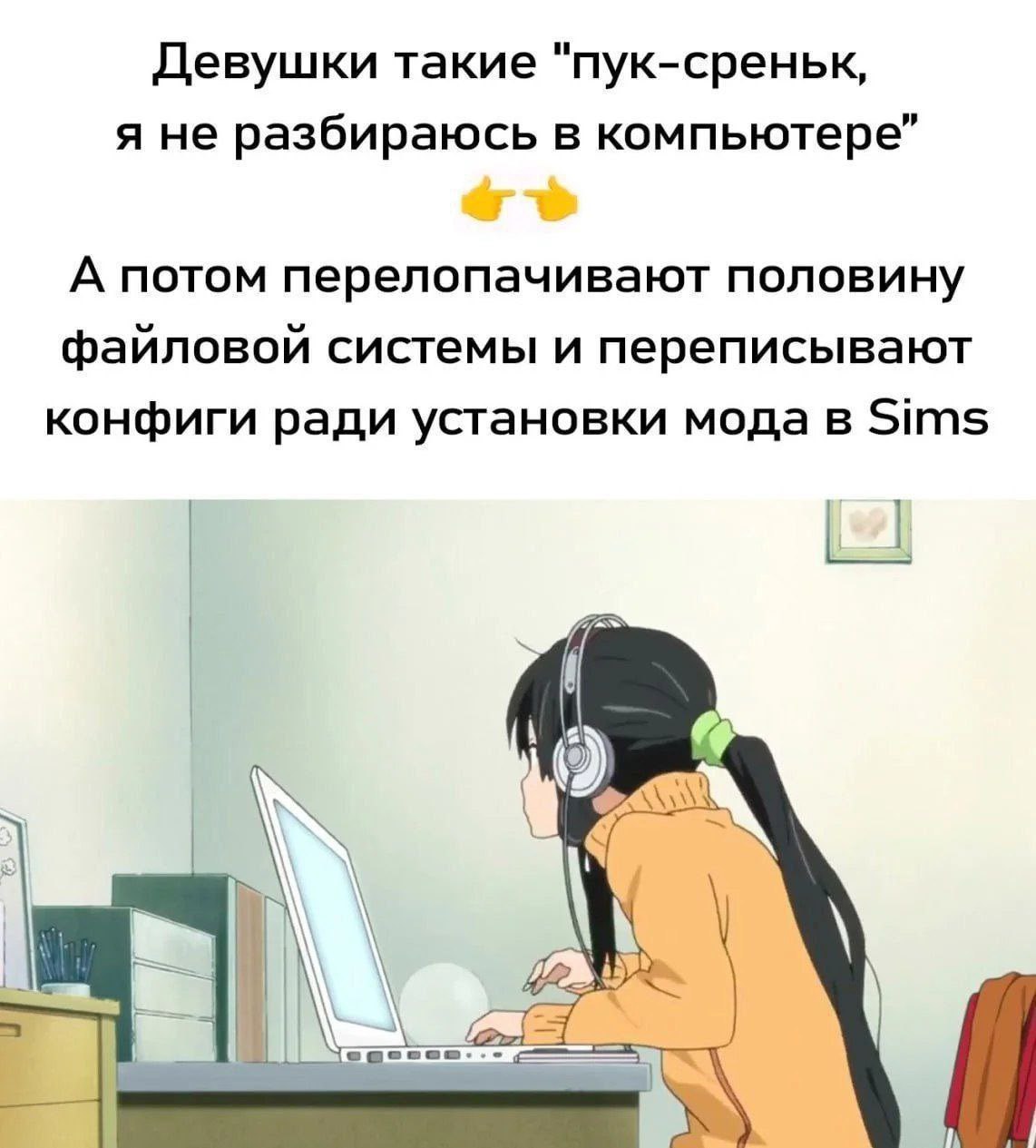 Мем изображает стереотипное поведение девушек, которые сначала утверждают, что "я не разбираюсь в компьютере", а затем, когда дело доходит до их интересов, например, установки модов в игре The Sims, проявляют неожиданные навыки и усидчивость в работе с файловой системой и конфигурационными файлами. На изображении представлена девушка из аниме, сидящая за ноутбуком в наушниках, увлеченно печатающая, что символизирует ее погружение в "сложные" компьютерные задачи ради любимой игры. Этот мем иронизирует над кажущейся неосведомленностью в технических вопросах, которая исчезает, когда появляется сильная мотивация.