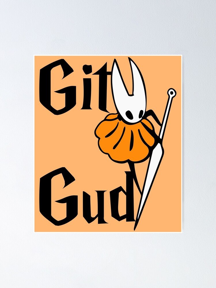 На изображении представлен персонаж из популярной видеоигры Hollow Knight, выполненный в стилизованном мультяшном виде. Персонаж имеет белое тело, напоминающее маску, и черные глаза. На нем надета оранжевая юбка или накидка, стилизованная под тыкву. В одной руке персонаж держит тонкий белый меч или рапиру, направленный острием вниз. На оранжевом фоне по бокам от персонажа крупными черными буквами написана фраза "Git Gud", что переводится как "стань лучше" или "научись играть нормально". Этот мем обычно используется в игровом сообществе, чтобы подколоть или мотивировать других игроков, которые жалуются на сложность игры.