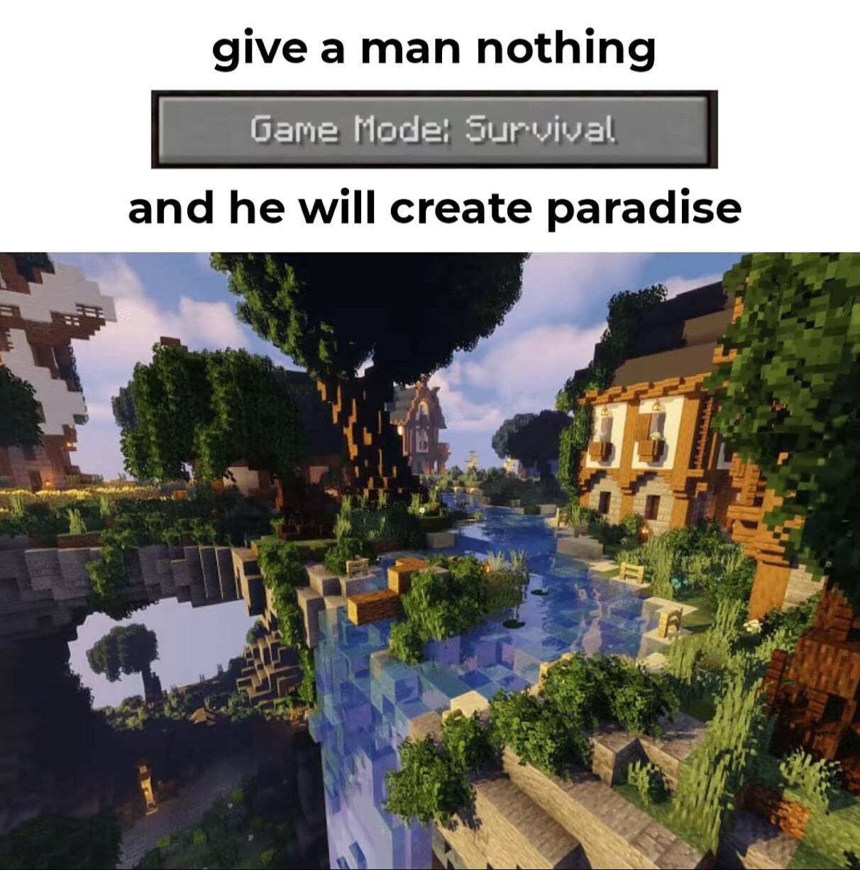 Give a man nothing. Game Mode: Survival. And he will create paradise.