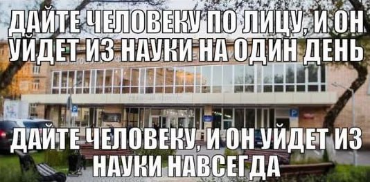 Мем основан на игре слов: на фоне здания, напоминающего НИИ, изображены две скамейки. Над первой скамейкой написано: "Дайте человеку по лицу, и он уйдет из науки на один день". Над второй скамейкой, перед которой, видимо, не хватило места для всего текста, присутствует игра слов. Там написано: "Дайте человеку, и он уйдет из науки навсегда". То есть, достаточно просто дать человеку что-то, предположительно деньги или какую-то выгоду, чтобы он навсегда покинул научную сферу. Мем намекает на низкую мотивацию или недостаточное финансирование в науке, из-за чего многие готовы уйти из неё ради более выгодных предложений.