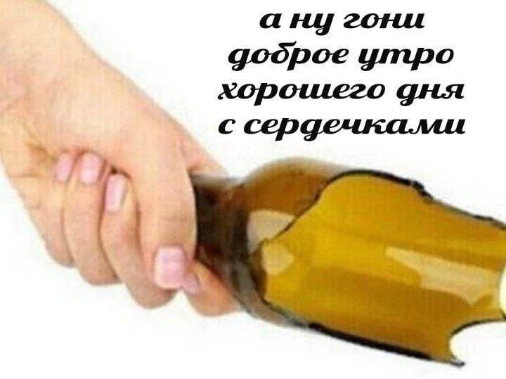 На изображении показана рука, держащая разбитую стеклянную бутылку, часть горлышка которой отколота и заострена. Рука крепко сжимает бутылку. Сверху на картинке расположен текст "А ну гони доброе утро хорошего дня с сердечками", что на русском языке означает "А ну-ка, давай свое доброе утро, хорошего дня с сердечками". Этот текст создает комический контраст между агрессивным жестом и милыми, доброжелательными фразами, которые обычно используют для приветствия или пожеланий.
