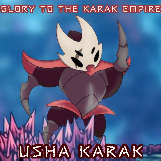 На изображении представлен персонаж из игры "Hollow Knight", стилизованный под нечто среднее между рыцарем и жуком, стоящий на фоне синего неба и розовых кристаллов. Герой изображен в темных доспехах с красными акцентами, а его голова украшена белым шлемом, напоминающим маску с рогами. В правой руке он держит изогнутое лезвие. Надпись на изображении гласит "GLORY TO THE KARAK EMPIRE", что переводится как "Слава империи Караков", и "USHA KARAK". Этот арт, вероятно, является фан-артом или кроссовером, где персонаж "Hollow Knight" представлен в контексте другой вымышленной вселенной, возможно, связанной с "Империей Караков". Персонаж выглядит воинственно и решительно, готовый к бою или к выполнению важной миссии. Фон с кристаллами добавляет изображению загадочности и фэнтезийности.