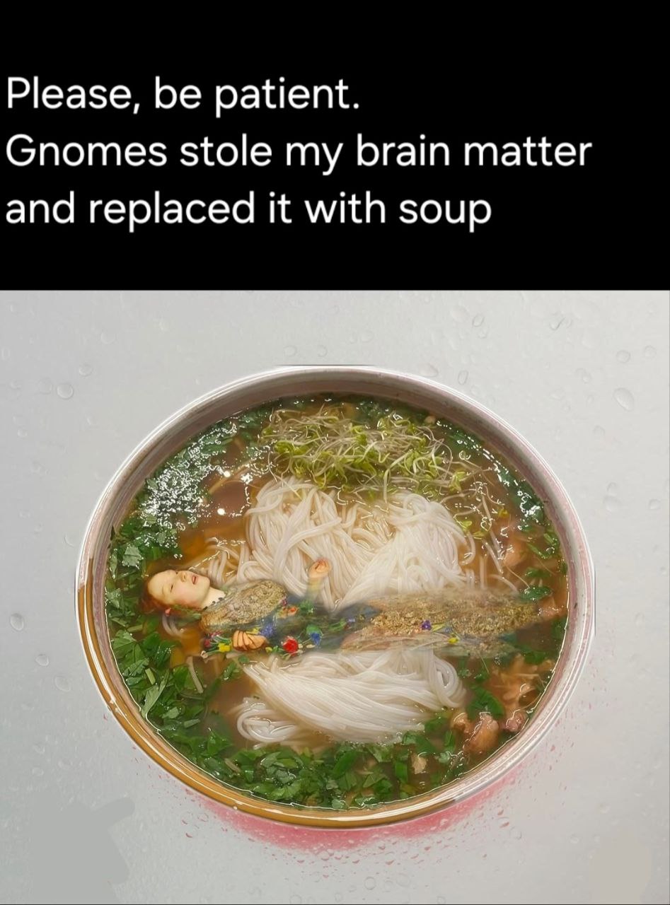 Мем изображает миску супа, предположительно фо-бо, с лапшой, зеленью и ростками. В центре супа лежит маленькая кукольная фигурка, напоминающая ребенка, одетого в наряд с цветами, создавая сюрреалистическую и странную картину. Над изображением супа расположен текст: "Please, be patient. Gnomes stole my brain matter and replaced it with soup" (Пожалуйста, будьте терпеливы. Гномы украли мое вещество мозга и заменили его супом). Этот мем используется для выражения состояния замешательства, глупости или временной неспособности ясно мыслить, часто в юмористическом ключе, когда человек чувствует себя отвлеченным или "не в себе".