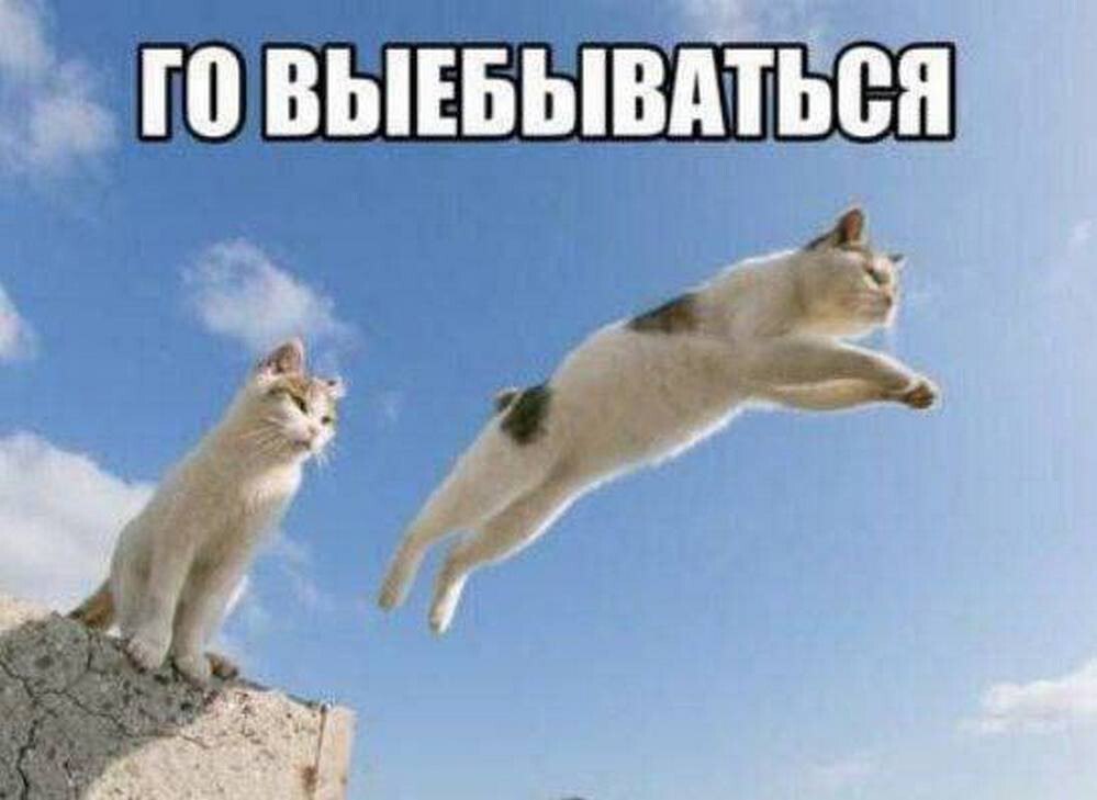 На изображении показаны две кошки на фоне ярко-голубого неба с редкими белыми облаками. Слева на краю невысокой каменной стены или выступа сидит светло-рыжий кот, смотрящий вправо. Справа от него, в прыжке, застыла другая кошка, преимущественно белая с темными пятнами, кажется, что она летит горизонтально в воздухе. Над кошками крупным белым шрифтом с черной обводкой написано «ГО ВЫЕБЫВАТЬСЯ», что можно перевести как «Идём выпендриваться».