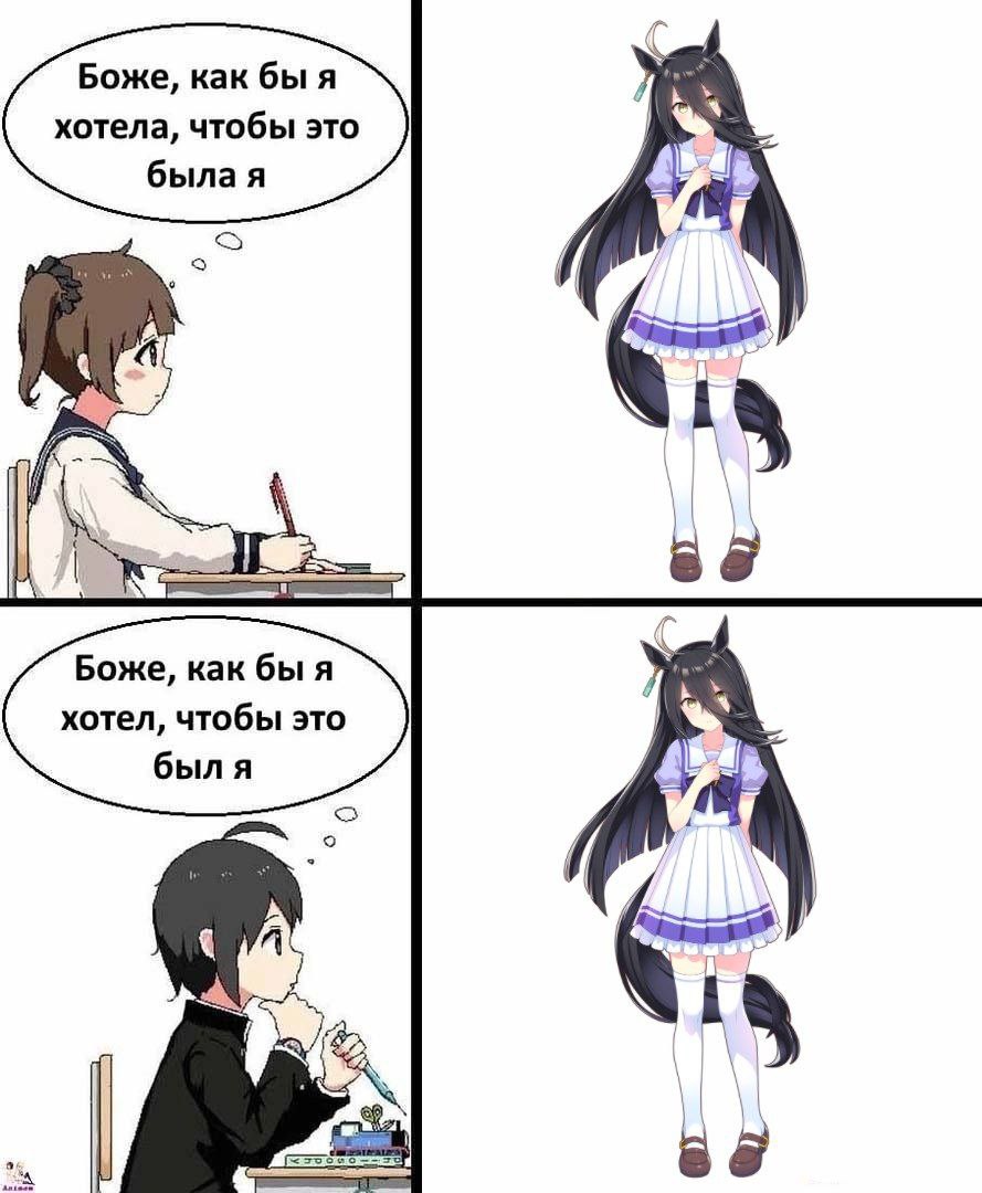 На изображении представлен комикс из четырех панелей. В верхнем левом углу изображена девушка-школьница с каштановыми волосами, сидящая за столом и смотрящая в сторону, с репликой: "Боже, как бы я хотела, чтобы это была я". На верхней правой панели изображен милый аниме-персонаж в образе лошадки с черными волосами, в фиолетовом топе и белой юбке. В нижнем левом углу изображен парень-школьник с черными волосами, сидящий за столом и также смотрящий в сторону, с той же репликой: "Боже, как бы я хотел, чтобы это был я". На нижней правой панели снова изображен тот же аниме-персонаж. Мем выражает желание персонажей стать милым аниме-персонажем.