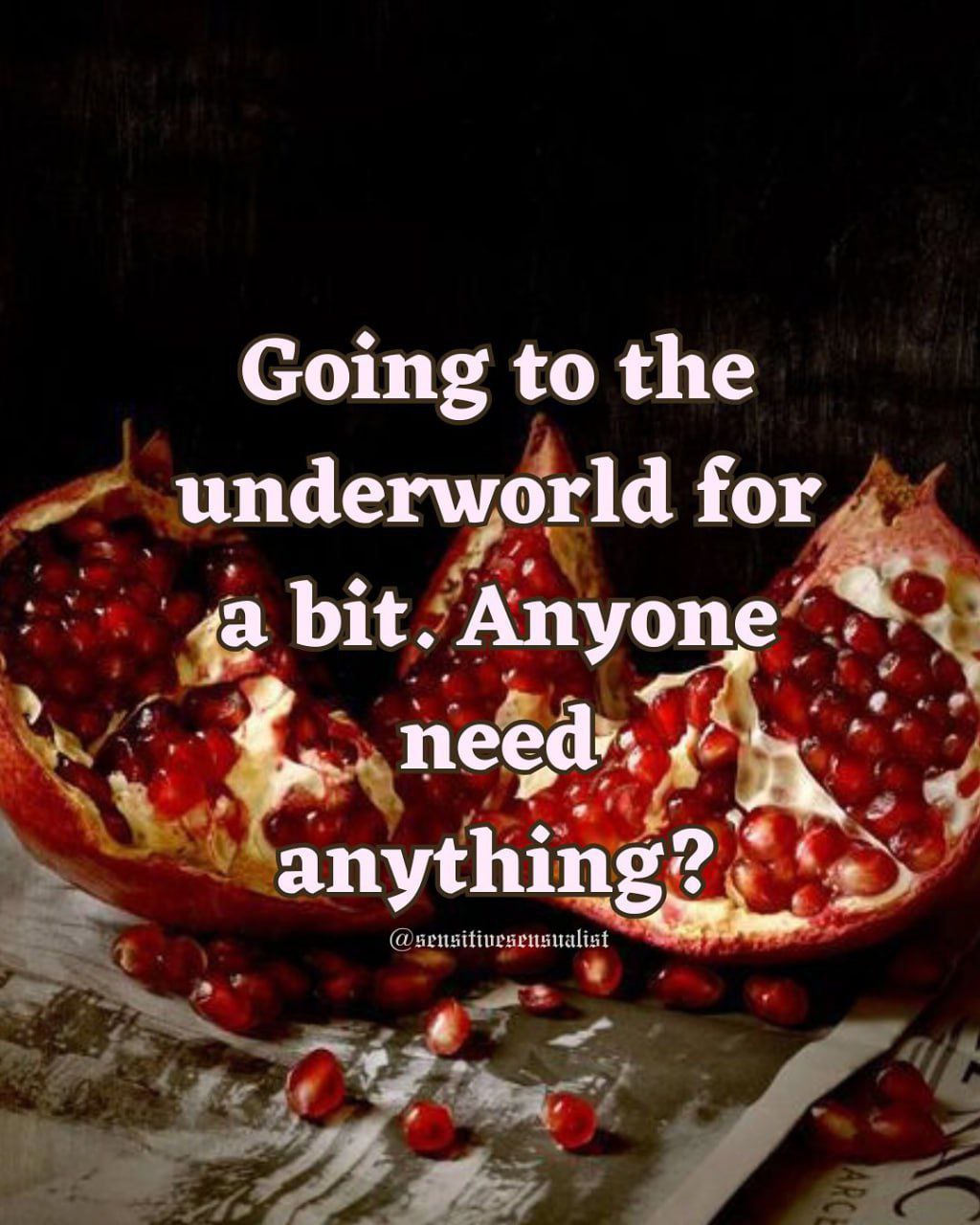На изображении представлен гранат, разрезанный пополам, с ярко-красными, сочными зернами, которые видны внутри. Рядом с ним рассыпаны несколько зерен, лежащих на темной, возможно, немного мятой поверхности, создавая атмосферу загадочности и древности. Фоновый цвет очень темный, почти черный, что подчеркивает насыщенный цвет граната и создает контраст. Сверху на изображении наложен текст: "Going to the underworld for a bit. Anyone need anything?" (Иду в подземный мир ненадолго. Кому-нибудь что-нибудь нужно?). Это придает изображению юмористический и немного мрачный оттенок, отсылающий к мифу о Персефоне, которая была похищена Аидом и провела часть года в подземном мире, вкусив зерна граната.