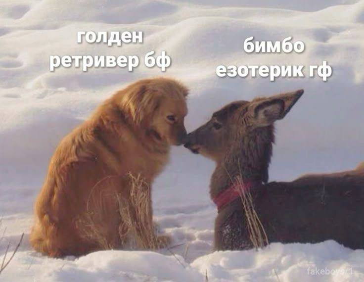 На изображении запечатлены голден ретривер и олениха, стоящие на заснеженной поверхности. Животные нежно соприкасаются носами, создавая впечатление поцелуя. Голден ретривер, сидящий слева, имеет подпись «голден ретривер бф», что означает «голден ретривер бойфренд». Олениха, лежащая справа, подписана как «бимбо эзотерик гф», то есть «бимбо эзотерик гёрлфренд». Олениха одета в красный ошейник. Мем, в котором голден ретривер – добрый и покладистый парень, а олениха – его девушка, которая является «бимбо эзотерик».