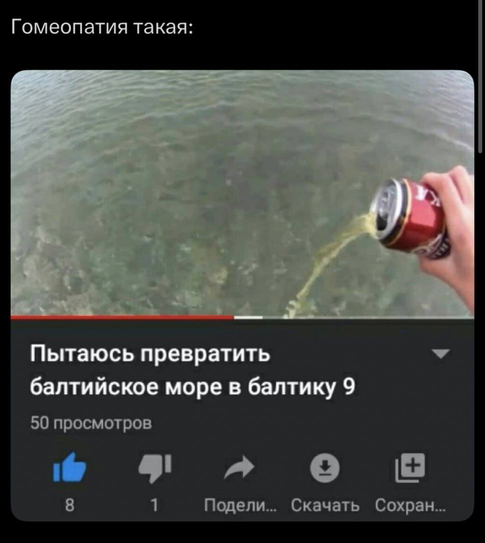 На картинке представлен скриншот из YouTube, где в верхней части видно, как чья-то рука выливает содержимое банки пива, предположительно "Балтика 9", в водоём, похожий на море или озеро. Вода в водоёме выглядит прозрачной, и дно с камнями просвечивается. Под этим изображением находится заголовок видео: "Пытаюсь превратить балтийское море в Балтику 9". В верхней части мема также есть надпись: "Гомеопатия такая:", что связывает происходящее с принципами гомеопатии, где очень малые дозы вещества разбавляются в огромных объёмах воды, что, по мнению мема, аналогично попытке изменить целое море, добавив в него немного пива.