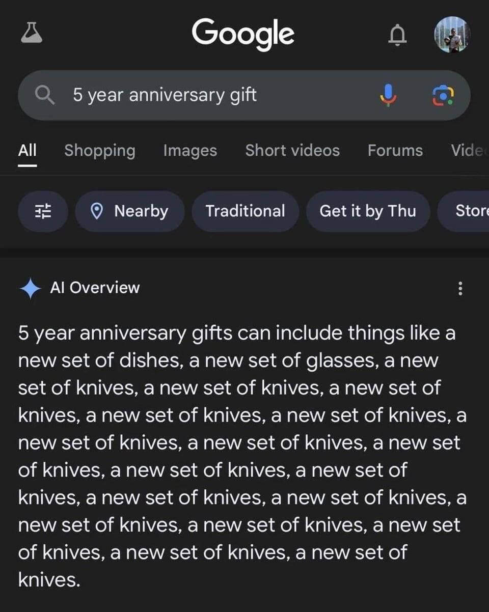 На изображении показан скриншот поиска Google в темной теме. В строке поиска введен запрос "5 year anniversary gift" (подарок на пятилетие). Ниже расположены различные фильтры поиска, такие как "All" (Все), "Shopping" (Покупки), "Images" (Изображения), "Short videos" (Короткие видео), "Forums" (Форумы) и другие. Также видны кнопки "Nearby" (Рядом), "Traditional" (Традиционные) и "Get it by Thu" (Получить до четверга). Под строкой поиска отображается блок "AI Overview" (Обзор ИИ), который, предположительно, должен давать краткое и полезное резюме по запросу. Однако, в данном случае, результаты выглядят комично или даже тревожно: "5 year anniversary gifts can include things like a new set of dishes, a new set of glasses, a new set of knives, a new set of knives, a new set of knives, a new set of knives, a new set of knives, a new set of knives, a new set of knives, a new set of knives, a new set of knives, a new set of knives, a new set of knives, a new set of knives, a new set of knives, a new set of knives, a new set of knives" (подарки на 5-летний юбилей могут включать такие вещи, как новый набор посуды, новый набор стаканов, новый набор ножей, новый набор ножей, новый набор ножей и так далее, повторяя "новый набор ножей" множество раз). Это создает юмористический эффект из-за абсурдного повторения.