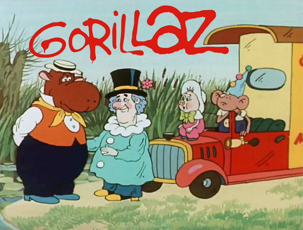 На изображении представлен кадр из советского мультфильма «Приключения поросёнка Фунтика», на котором слева направо стоят бегемот Шоколад, госпожа Белладонна и два ее сыщика, Дырочка и Пинчер, едущие в красном автомобиле. Сверху красными буквами написано «Gorillaz». В меме объединяется известный мультфильм с логотипом популярной британской виртуальной группы Gorillaz, что создает контрастный и забавный эффект. Этот мем может быть использован для выражения неожиданных или необычных комбинаций, а также для шуток о старых мультфильмах и современной музыке.