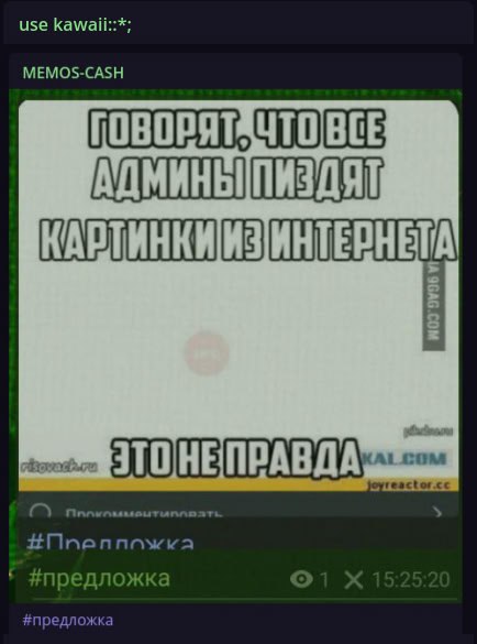 На картинке изображен мем с текстом, который высмеивает распространенное мнение о том, что администраторы групп и пабликов в интернете воруют контент. Мем выполнен в простом стиле, с использованием крупного шрифта на светлом фоне. В верхней части мема написано "Говорят, что все админы пиздят картинки из интернета", а в нижней части, отделенной небольшим пустым пространством, следует опровержение: "Это не правда". Этот мем является ироничным комментарием к практике заимствования контента в сети и популярной фразой "Это не правда", которую часто используют для отрицания очевидного или ироничного подтрунивания. Мем вызывает улыбку у тех, кто знаком с этой интернет-реальностью. Ниже мема видны элементы пользовательского интерфейса, такие как надпись "Прокомментировать" и хештеги "#Предложка" и "#предложка", а также счетчик просмотров и время публикации, что указывает на то, что изображение является скриншотом из социальной сети или форума.