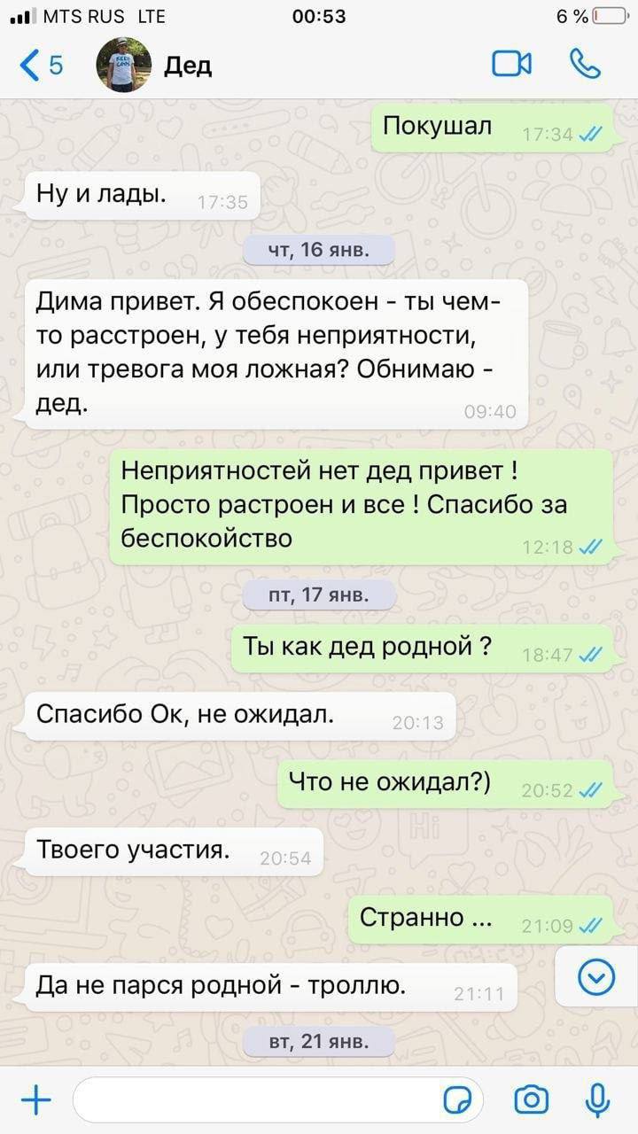 Ну и лады. Покушал. Дима привет. Я обеспокоен - ты чем-то расстроен, у тебя неприятности, или тревога моя ложная? Обнимаю - дед. Неприятностей нет дед привет! Просто расстроен и все! Спасибо за беспокойство. Ты как дед родной? Спасибо Ок, не ожидал. Что не ожидал? Твоего участия. Странно... Да не парся родной - троллю.