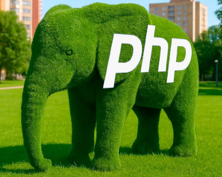 На картинке изображен зеленый слон из травы, стоящий на зеленом газоне в парке. На боку слона большими белыми буквами написано «Php». Это логотип языка программирования PHP. Изображение выглядит необычно и привлекает внимание, так как слон сделан из травы.