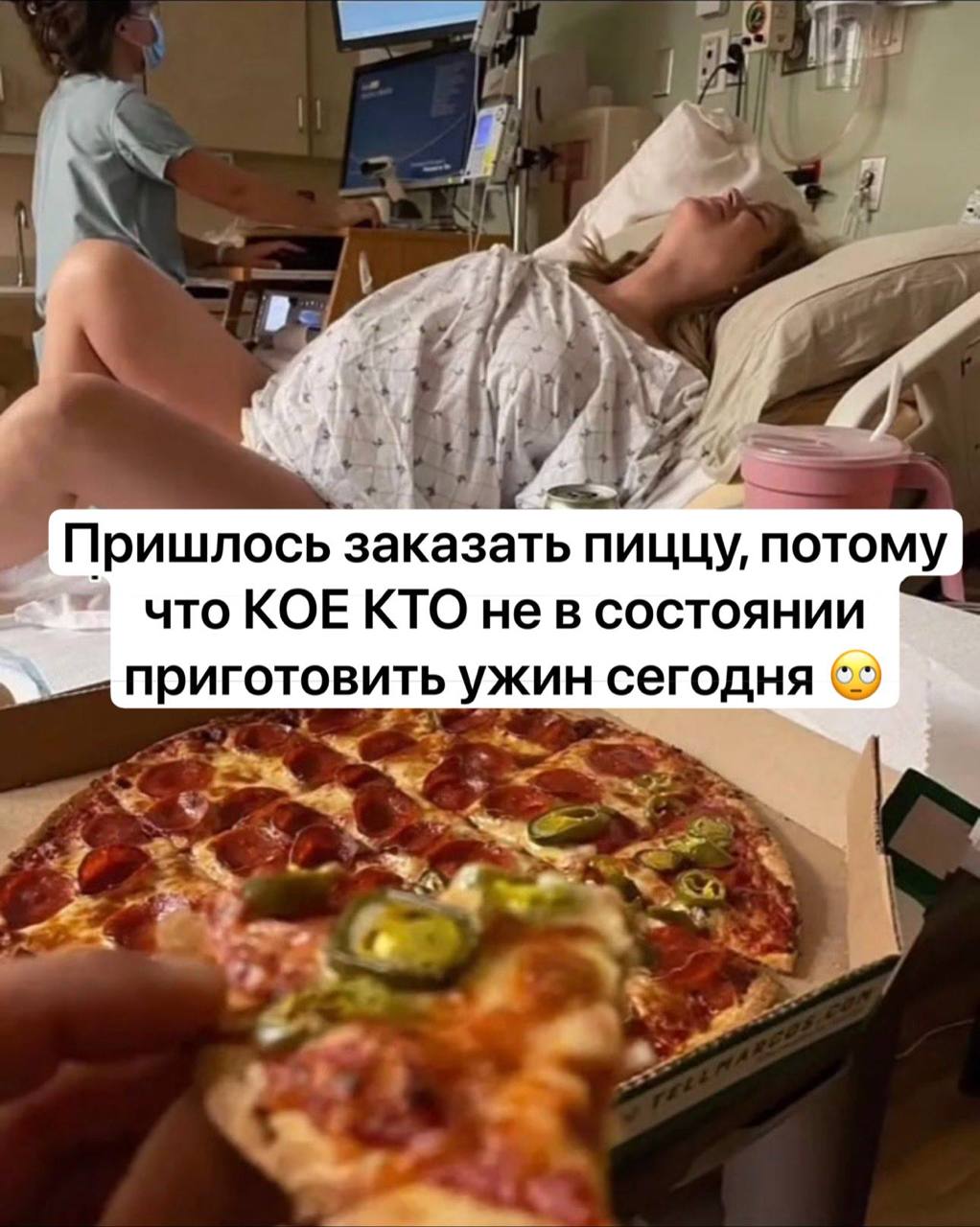 Мем состоит из двух частей. В верхней части показана молодая женщина, лежащая на больничной койке, очевидно, после родов. Рядом с ней стоит медсестра, а на заднем плане видны медицинские приборы. Женщина выглядит усталой, но довольной. Нижняя часть мема представляет собой изображение свежеприготовленной пиццы с пепперони и халапеньо, которую держит чья-то рука. Надписи на мем гласят: "Пришлось заказать пиццу, потому что кое-кто не в состоянии приготовить ужин сегодня". Это намекает на то, что муж (или партнер) заказал еду на вынос, потому что новоиспеченная мама слишком устала или не в состоянии готовить.