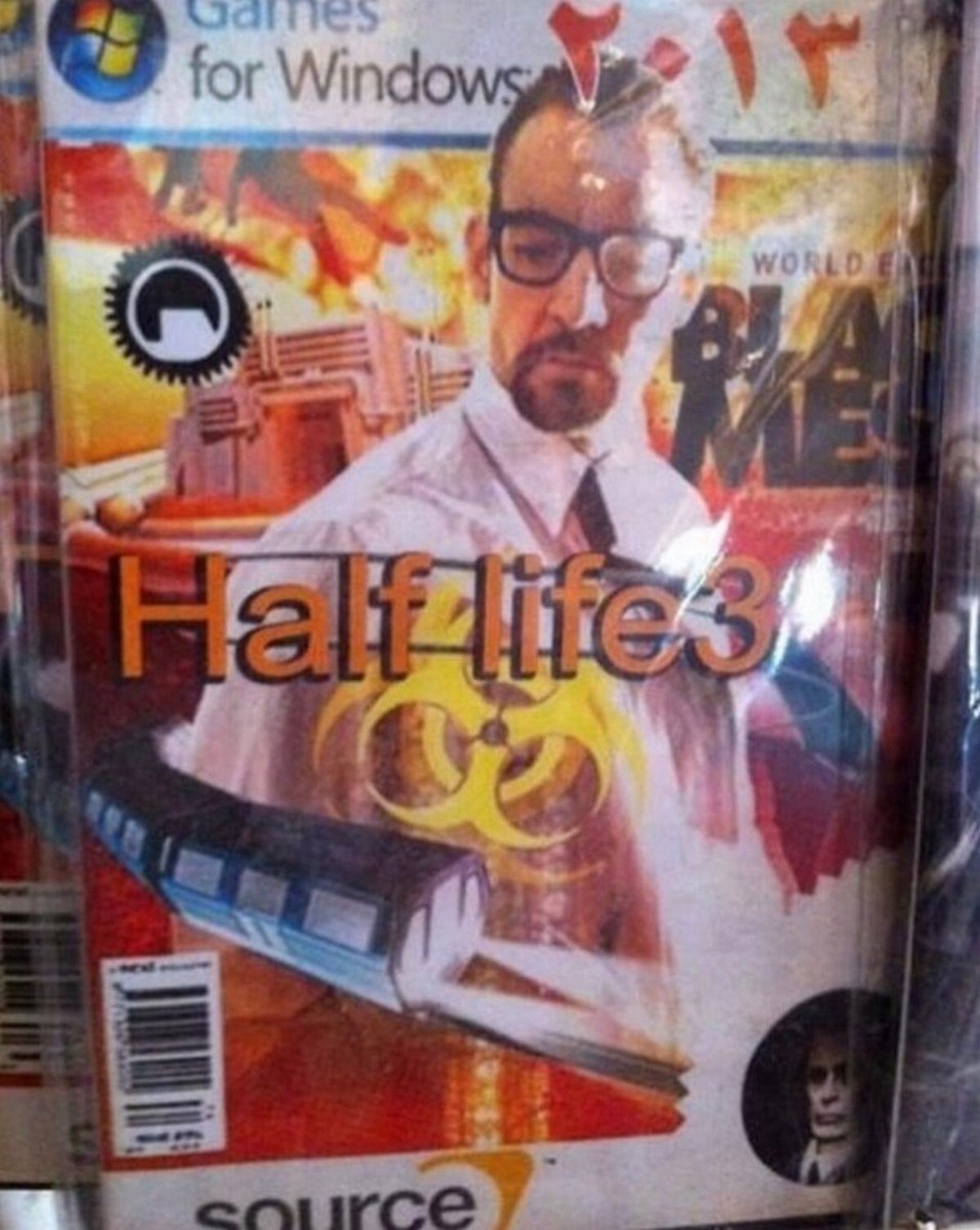 На изображении видна обложка компьютерной игры Half-Life 3, стилизованная под пиратский диск «Игры для Windows». На переднем плане изображен Гордон Фримен, главный герой серии Half-Life, но с бородой и в очках, напоминающий Уолтера Уайта из сериала «Во все тяжкие». На заднем плане виден ядерный взрыв и поезд, вылетающий из портала. Внизу обложки, в правом углу, находится лицо G-Man'а, загадочного персонажа из игры. Также присутствуют различные элементы, характерные для пиратских обложек, такие как штрих-код и логотип Windows. Обложка игры Half-Life 3, которая так и не вышла, часто становится предметом шуток и мемов. Этот дизайн сочетает в себе ожидание фанатов Half-Life и отсылки к другим популярным культурным явлениям, что делает его особенно забавным.