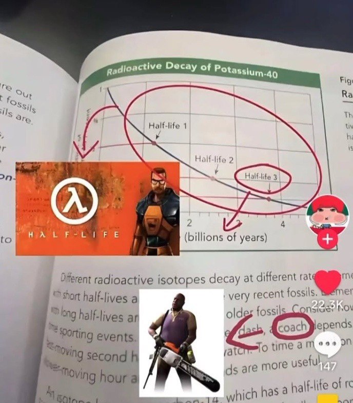 На изображении показана страница из учебника с графиком "Radioactive Decay of Potassium-40" (Радиоактивный распад калия-40). На этом графике обозначены "Half-life 1", "Half-life 2" и "Half-life 3". Последний, "Half-life 3", обведен красным кругом, и от него стрелка указывает на обложку игры Half-Life с персонажем Гордоном Фрименом. Это отсылка к долгожданному и так и не вышедшему продолжению игры — Half-Life 3. В нижней части страницы, под текстом о радиоактивных изотопах, добавлен персонаж по имени Coach (Коуч) из игры Left 4 Dead 2 с бензопилой, а слово "coach" также обведено красным кругом. Это создает многослойный мем, объединяющий две популярные игры и научную тему.