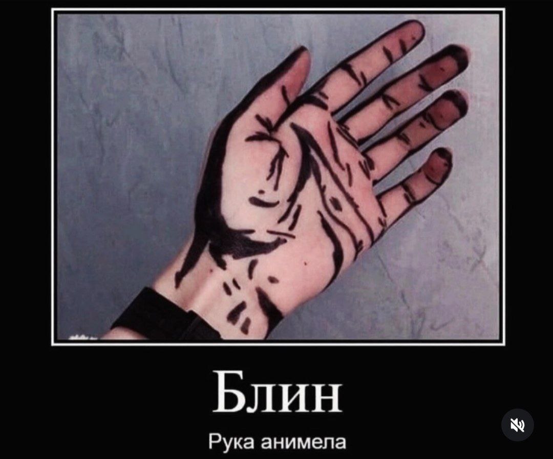 На изображении показана рука человека, раскрашенная черным маркером или краской, чтобы выглядеть как полосатая шкура тигра. Полосы нарисованы вдоль пальцев и ладони, создавая иллюзию необычной текстуры кожи. На фоне видна серая стена или другая нейтральная поверхность. Под изображением на черной плашке написано: "Блин. Рука анимела". Это шутка, обыгрывающая схожесть слова "онемела" (потеряла чувствительность) со словом "аниме" (стиль японской анимации), а также то, что рука раскрашена в стиле, похожем на персонажей или образы из аниме, особенно если речь идет о какой-то трансформации. Таким образом, фраза "Рука анимела" обыгрывает как эффект онемения, так и стилизацию под аниме.
