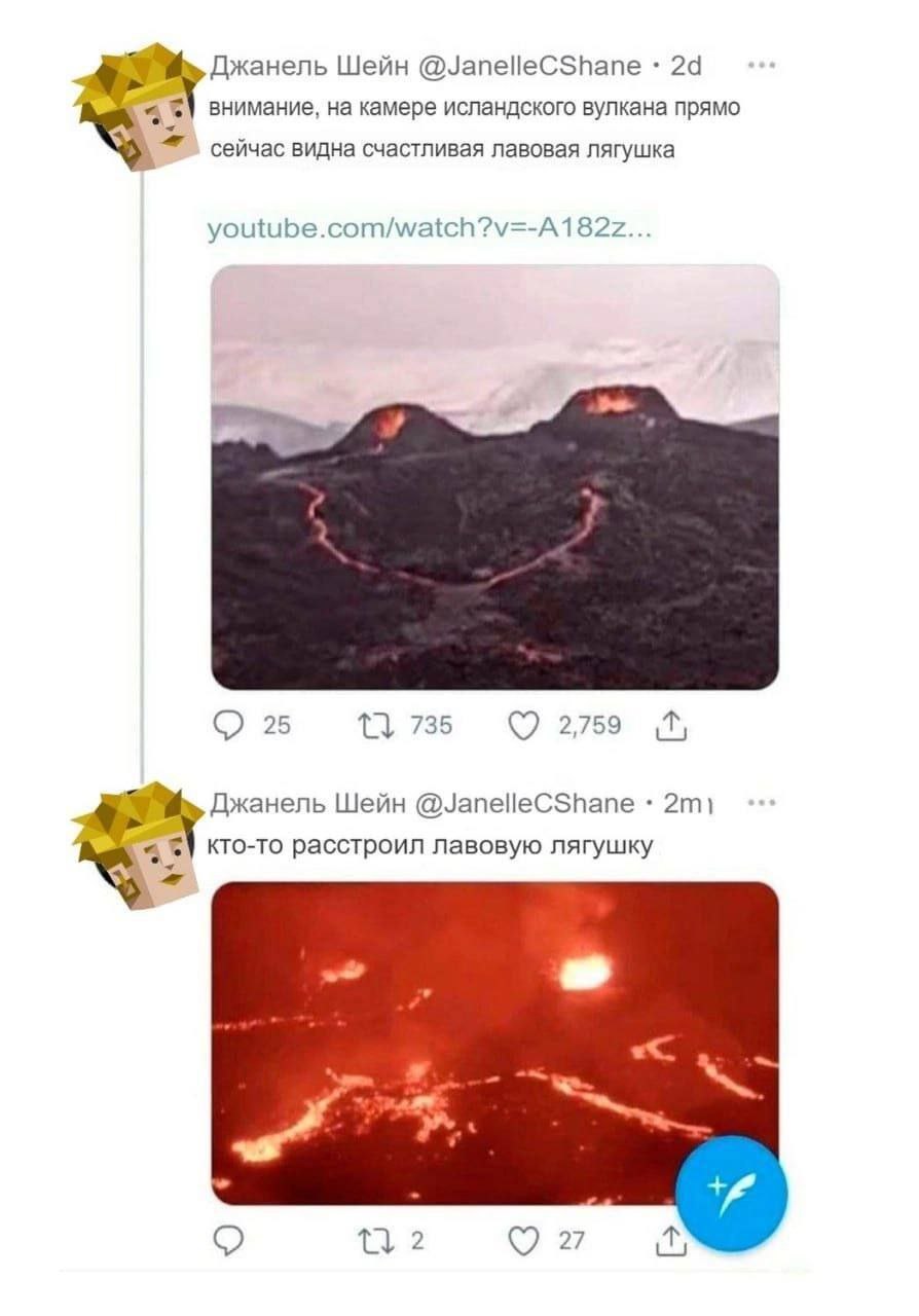 Джанель Шейн @JanelleCShane. Внимание, на камере исландского вулкана прямо сейчас видна счастливая лавовая лягушка. Джанель Шейн @JanelleCShane. Кто-то расстроил лавовую лягушку.