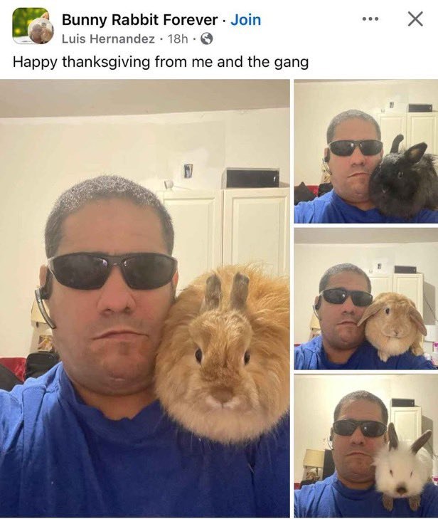 Мем состоит из четырех частей: слева большая фотография мужчины в солнцезащитных очках и синей футболке с рыжим кроликом на плече. Справа три маленькие фотографии того же мужчины, на каждой из которых он держит на плече разных кроликов: черного, светло-коричневого и белого. Мужчина выглядит очень серьезным, а кролики милые и пушистые. Надпись на скриншоте "Happy thanksgiving from me and the gang" переводится как "С Днем благодарения от меня и банды".