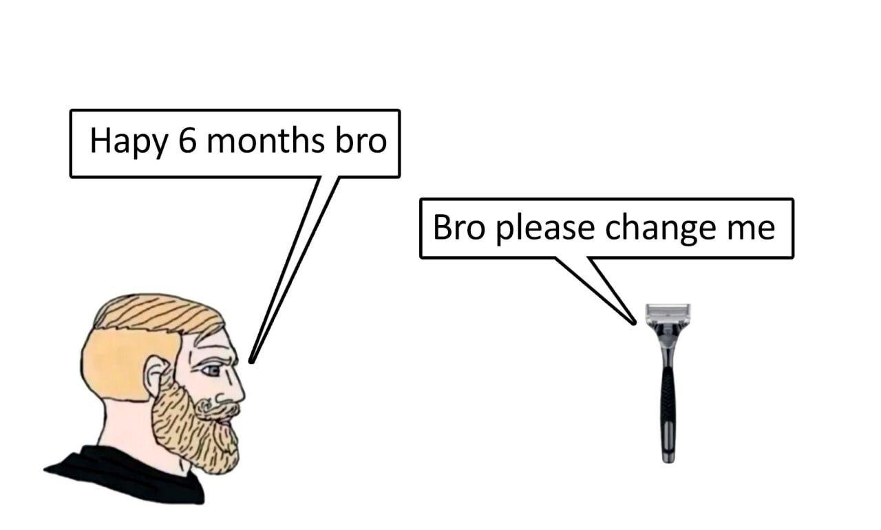 Мем изображает Чада, популярного персонажа интернет-культуры, который является воплощением мужественности и уверенности. У него светлые волосы и густая борода. Он обращается к бритве со словами: "Hapy 6 months bro" (С 6 месяцами, брат), на что бритва отвечает: "Bro please change me" (Брат, пожалуйста, поменяй меня). Этот мем высмеивает привычку некоторых людей долго не менять бритвенные лезвия, несмотря на их износ. Он подчеркивает контраст между внешним образом брутального и ухоженного мужчины и его небрежным отношением к гигиене, которое проявляется в использовании старой бритвы.
