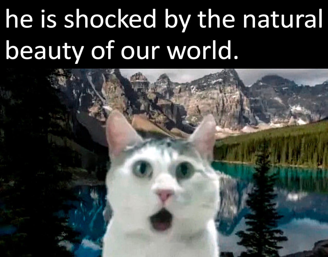 На изображении представлен широко известный мем, где кот с широко раскрытыми глазами и ртом изображен на фоне живописного пейзажа с горами, лесом и озером. Текст сверху гласит: "he is shocked by the natural beauty of our world." (он шокирован природной красотой нашего мира), что объясняет выражение морды кота. Этот мем часто используется для выражения удивления, восхищения или шока от чего-либо красивого, грандиозного или просто неожиданного.