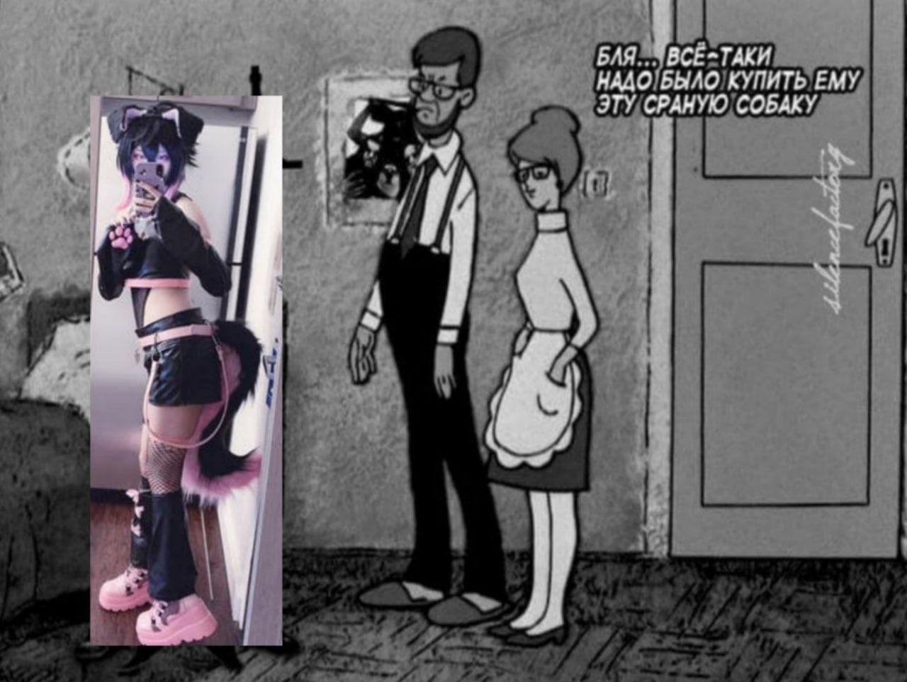 Мем представляет собой коллаж, где на фоне черно-белого рисунка, стилизованного под старый мультфильм, расположен цветной снимок девушки в необычном костюме. На рисунке изображена пара – мужчина в рубашке, жилете и подтяжках, и женщина в домашнем платье с фартуком. Оба стоят и смотрят в сторону, при этом мужчина произносит фразу: "Бля... всё-таки надо было купить ему эту сраную собаку". В центре изображения, поверх этого рисунка, находится вертикальный прямоугольный вырез с фотографией девушки. Девушка одета в откровенный наряд: короткий топ, кожаные шорты, чулки в сетку и обувь на высокой платформе розового цвета. На голове у неё ушки, а сзади виден пушистый хвост, что создает образ кошкодевочки или фурри. Она делает селфи в зеркале, держа телефон перед собой. Вероятно, мем иронизирует над тем, как подростки или молодые люди увлекаются необычными субкультурами, и вызывает у родителей сожаление о несбывшихся ожиданиях или о том, что они когда-то не купили своему чаду что-то более простое и "нормальное", например, собаку, чтобы предотвратить такие увлечения.
