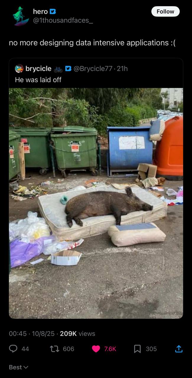 На изображении показан дикий кабан, спящий на матрасе, брошенном посреди грязного участка с мусорными баками. Вокруг валяется много мусора, пакетов и коробок, что создает впечатление заброшенности. Кабан лежит, свернувшись калачиком, на белом матрасе, на котором также видна синяя подушка. Общий контекст твита над изображением "He was laid off" (Его уволили) добавляет мему ироничный или печальный оттенок, предполагая, что кабан символизирует человека, потерявшего работу и оказавшегося в плачевном положении.