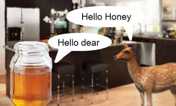 На изображении показана банка с медом (Honey) и олень (Dear). Банка говорит: "Hello Honey", а олень отвечает: "Hello dear". Это игра слов, так как Honey (мед) и dear (олень) звучат очень похоже на ласковые обращения "дорогая" и "дорогой". Фон изображения представляет собой интерьер современной кухни с барной стойкой и стульями. Мем очень забавный и построен на игре слов, которая создает комический эффект от диалога двух "персонажей".