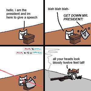 Hello, i am the president and im here to give a speech. Blah blah blah. Get down mr. President! All your heads look bloody twelve feet tall!