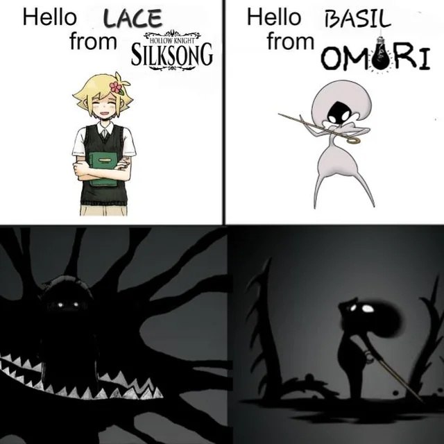 Мем разделён на четыре части. В верхней левой части изображён персонаж Lace из игры Hollow Knight Silksong в своём обычном виде, с текстом "Hello Lace from Silksong". В верхней правой части изображён персонаж Basil из игры Omori в своём обычном виде, с текстом "Hello Basil from Omori". В нижних частях мема показаны эти же персонажи, но уже в тёмном, более угрожающем виде. Слева снизу Lace представлен как тёмный силуэт с острыми зубами и ветвистыми отростками. Справа снизу Basil показан как тёмная фигура с горящими глазами, стоящая среди тёмных деревьев и держащая в руках посох. Мем сравнивает "милых" и "нормальных" персонажей с их более пугающими и мрачными версиями, символизирующими "что-то пошло не так" или "тёмную сторону".