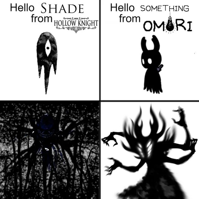 Мем состоит из четырех панелей, демонстрирующих сходство между персонажами из разных видеоигр. В левом верхнем углу изображен “Shade” из игры Hollow Knight с подписью “Hello SHADE from HOLLOW KNIGHT”. В правом верхнем углу находится “Something” из игры OMORI с надписью “Hello SOMETHING from OMORI”. В нижней левой части изображения показана зловещая, черная фигура с множеством конечностей, которая кажется более развитой формой “Shade”. В нижней правой части изображен похожий, но более жуткий и угрожающий образ “Something” с множеством когтистых рук и пламевидными элементами. Мем сравнивает эволюцию или более пугающие формы этих двух персонажей, подчеркивая их общую тему тени и ужаса. Тем самым он отмечает, что фанаты обеих игр могут провести параллели между этими сущностями.