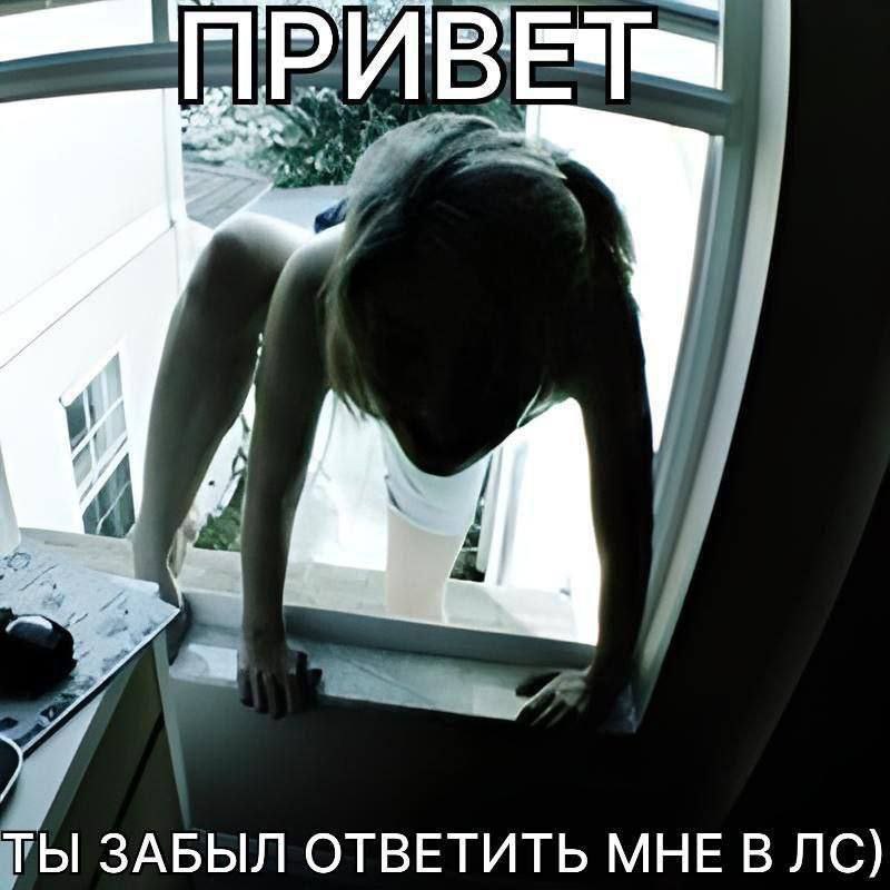 На изображении показана девушка, которая лезет в окно или из окна. Она одета в светлую одежду, и её силуэт виден на фоне светлого проёма окна, за которым видны деревья и здание. Снизу и сверху на картинке есть надписи. Надпись сверху гласит «ПРИВЕТ», а снизу «ТЫ ЗАБЫЛ ОТВЕТИТЬ МНЕ В ЛС)». Эта картинка часто используется для шуток о навязчивых собеседниках или о случаях, когда кто-то забывает ответить на сообщения, а его собеседник становится очень настойчивым, вплоть до того, что буквально появляется в окне.