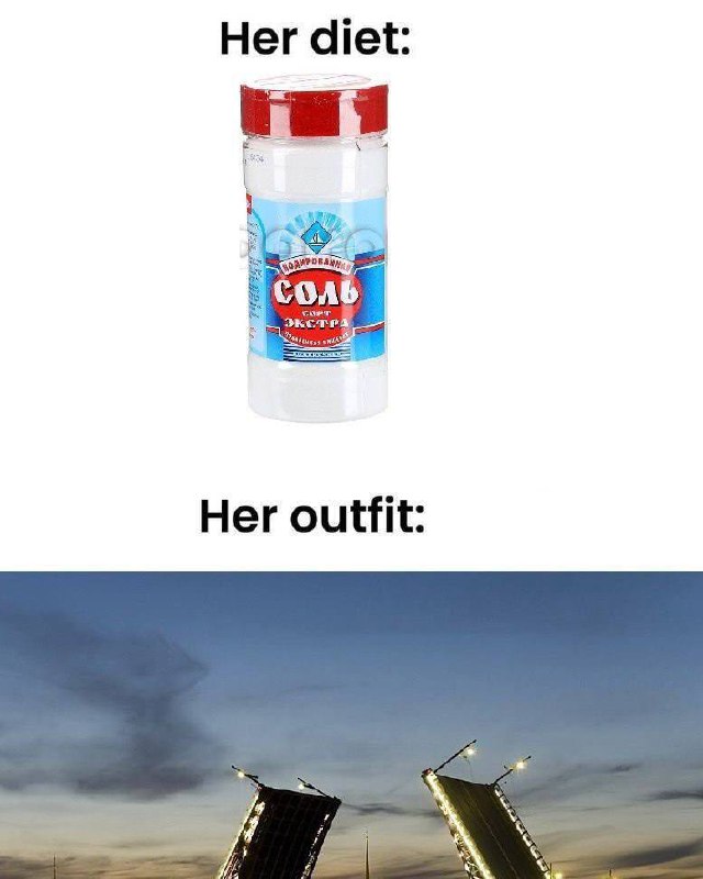 На изображении представлен мем, состоящий из двух частей. В верхней части показана подпись "Her diet:" (Её диета:) и фотография пачки соли, что намекает на метафору солёной или очень острой личности. В нижней части мема подпись "Her outfit:" (Её наряд:) и изображение разведенного моста, по всей видимости Дворцового моста в Санкт-Петербурге, что символизирует открытый или откровенный наряд. Этот мем используется для юмористического описания девушки, которая является "соленой" (что в сленге может означать злую, едкую или вредную) и "разведенной" (то есть с открытым, оголяющим нарядом).