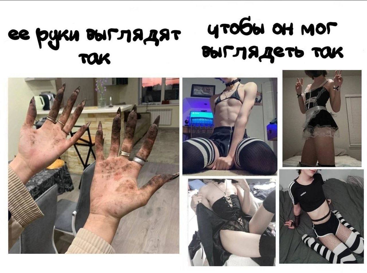 Мем состоит из двух частей. Слева изображены руки с длинными, заостренными ногтями, покрытыми грязью, которая также видна на фалангах пальцев и ладонях. Подпись к этой части гласит: "Ее руки выглядят так". Справа представлены четыре фотографии трансгендера или кроссдрессера в различных женских нарядах: облегающем бикини, костюме горничной, корсете и чулках, а также спортивном топе и коротких шортах с чулками. Подпись к этой части: "Чтобы он мог выглядеть так". Мем иронично указывает на то, что для поддержания привлекательного внешнего вида "он" (трансгендер или кроссдрессер) "ей" (его партнерше) приходится выполнять много "грязной" работы.