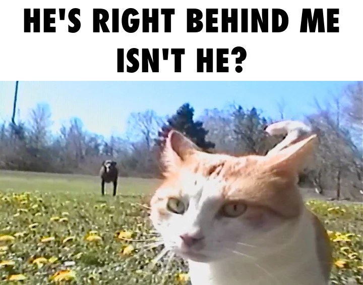 На переднем плане изображения рыжий с белым кот, который смотрит прямо перед собой. Его уши прижаты, а выражение морды выглядит немного испуганным или настороженным. На заднем плане, позади кота, стоит большая темная собака, которая смотрит в том же направлении, что и кот. Они находятся на зеленой лужайке, усыпанной желтыми одуванчиками, под ясным голубым небом. На горизонте видны деревья. Мем передает ощущение, будто кот понимает, что "He's right behind me, isn't he?" (Он прямо за мной, не так ли?), создавая забавную ситуацию предвкушения.