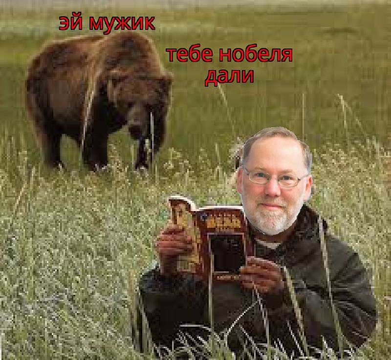 На этой мем-картинке мы видим бурого медведя, стоящего на заднем плане в поле, заросшем высокой травой. Он "говорит" человеку, сидящему на переднем плане: "Эй мужик, тебе нобеля дали" (что означает "Эй, чувак, тебе дали Нобелевскую премию"). Мужчина, которого, судя по всему, зовут Стивен Кук, изображен в очках и с бородой, сидит на корточках в траве и увлеченно читает книгу в твёрдой обложке. Его лицо выражает спокойствие и сосредоточенность, он, кажется, полностью поглощен чтением, игнорируя окружающий мир, включая медведя.