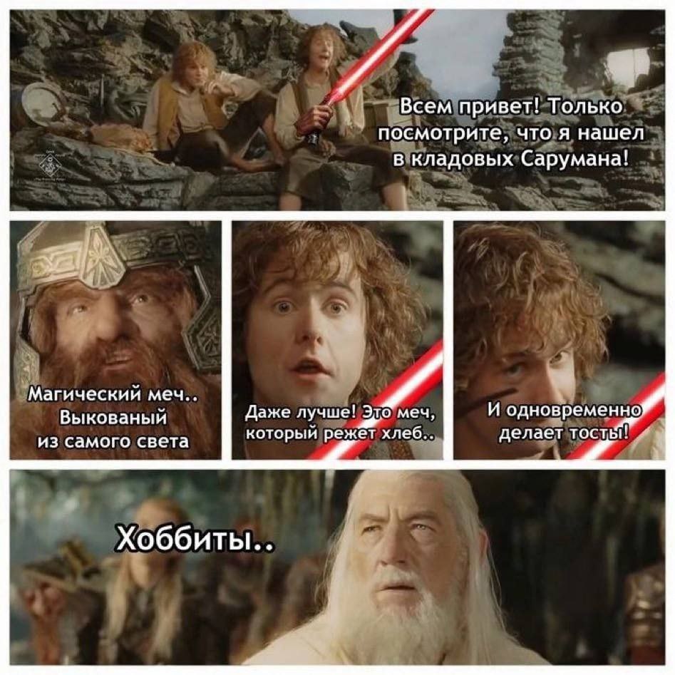 На изображении представлен мем из серии фильмов "Властелин колец", где хоббиты, гном и Гэндальф реагируют на световой меч из "Звёздных войн". В верхней части картинки два хоббита, видимо, Мерри и Пиппин, сидят на скале. Один из них держит в руке красный световой меч, а надпись гласит: "Всем привет! Только посмотрите, что я нашел в кладовых Сарумана!". Ниже гном Гимли с серьёзным выражением лица комментирует: "Магический меч... Выкованный из самого света". Затем следуют два кадра с хоббитом, скорее всего, Сэмом, который с восторгом заявляет: "Даже лучше! Это меч, который режет хлеб... И одновременно делает тосты!". В нижней части мема изображен Гэндальф с удивленным и немного расстроенным выражением лица, а надпись над ним просто гласит: "Хоббиты..". Этот мем обыгрывает разницу в восприятии мощного артефакта из разных вымышленных вселенных, демонстрируя приземленный взгляд хоббитов на фантастическую технологию.