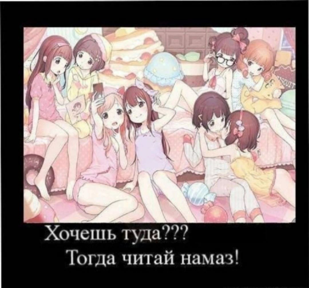 На изображении представлено множество девушек в пижамах, сидящих или лежащих на кровати или большой подушке. На заднем плане видны большие десерты, такие как многослойный торт и печенье. Девушки выглядят весёлыми и расслабленными, некоторые из них обнимаются, одна делает селфи на телефон. Атмосфера на картинке очень уютная и беззаботная. Ниже, под изображением, на чёрном фоне белыми буквами написано: «Хочешь туда??? Тогда читай намаз!» Это отсылка к исламской молитве, предполагающая, что соблюдение религиозных обрядов может привести к такому "раю" или приятному времяпрепровождению.