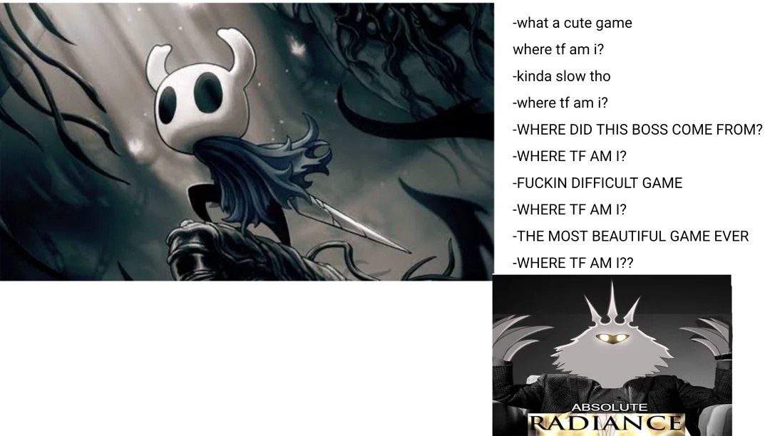 Мем иллюстрирует типичные этапы прохождения игры Hollow Knight, начиная от первого впечатления от "милой игры" до столкновения с её сложностями. Сначала игрок видит главного героя, Рыцаря, в красивом мрачном окружении, что вызывает впечатление о "милой игре". Затем, по мере прохождения, игра раскрывает свои медленные моменты и запутанные локации, приводя к вопросам "где я, черт возьми?". Кульминация наступает, когда игрок сталкивается с хардкорными боссами, такими как Absolute Radiance, что вызывает шок и признание "чертовски сложной игры". В итоге, несмотря на все трудности, игрок признает её "самой красивой игрой в истории", но продолжает задаваться вопросом о своём местоположении, ведь в игре очень легко заблудиться.