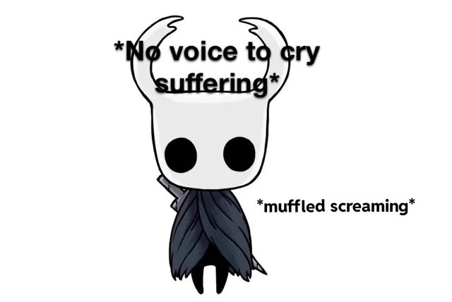 На меме изображен "Полый рыцарь" (Hollow Knight) — главный герой одноименной видеоигры. Он стоит прямо, в его левой руке виден меч, а его тело закрыто черным плащом. Над головой рыцаря виден текст "No voice to cry suffering", а справа от его тела — текст "muffled screaming". Это переводится как "Нет голоса, чтобы кричать от страданий" и "приглушенный крик", что подчеркивает безмолвность персонажа и его внутренние мучения. Забавный контекст в том, что персонаж безмолвен на протяжении всей игры.
