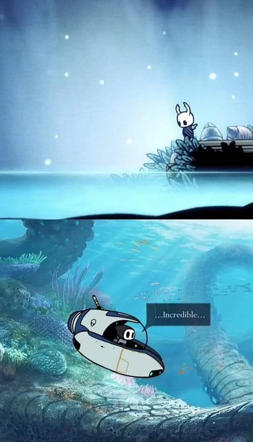 На картинке изображены два кадра, разделённые голубой полосой. В первом кадре над голубой поверхностью воды стоит персонаж из игры Hollow Knight, его отражение видно в воде. На заднем плане расставлены растения и виднеются несколько белых светящихся точек. Во втором кадре этот же персонаж плывёт в батискафе под водой. Он видит красивые подводные кораллы, водоросли, других рыб и, вероятно, огромную змею, поэтому произносит фразу: «Incredible…», что в переводе с английского означает «Невероятно…».