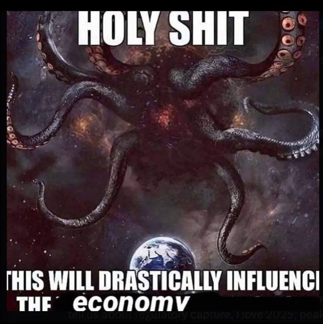 На изображении представлено темное, угрожающее существо с множеством щупалец, напоминающее гигантского кальмара или Ктулху, которое парит в космическом пространстве. Под ним находится маленькая, но узнаваемая планета Земля, которая выглядит незначительной по сравнению с чудовищным созданием. Над монстром крупными белыми буквами написано «HOLY SHIT», а под ним, частично закрывая нижнюю часть изображения, другая надпись: «THIS WILL DRASTICALLY INFLUENCE THE ECONOMY». Этот мем используется для выражения шока или удивления по поводу какого-либо события, которое, по мнению автора, окажет серьезное влияние на экономику или другие важные аспекты жизни. Фраза «Это кардинально повлияет на экономику» в сочетании с изображением вселенского монстра, парящего над Землей, создает ироничный контраст между нелепостью и абсурдностью происходящего и его якобы серьезными последствиями. Это может быть комментарий к новостям, политическим событиям или просто абсурдным ситуациям, которые могут иметь неожиданные или преувеличенные последствия.