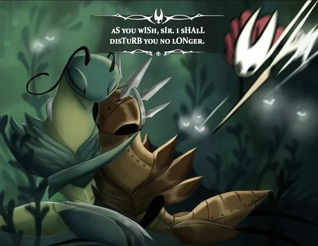 На картинке изображены два персонажа-жука, нежно обнимающие друг друга на фоне темных водорослей. В верхнем правом углу картинки виден персонаж Хорнет из игры Hollow Knight, стремительно летящий в их сторону с длинным копьем, оставляющим за собой светящийся след. Над головой Хорнет в белой рамке на черном фоне написан текст, который она произносит. Вокруг обнимающихся жуков парят маленькие светящиеся частицы. Мем "As you wish, sir" (Как пожелаете, сэр) обычно используется для изображения ситуаций, когда кто-то прерывает идиллию или интимный момент, часто с чувством драматизма или преувеличенной вежливости.